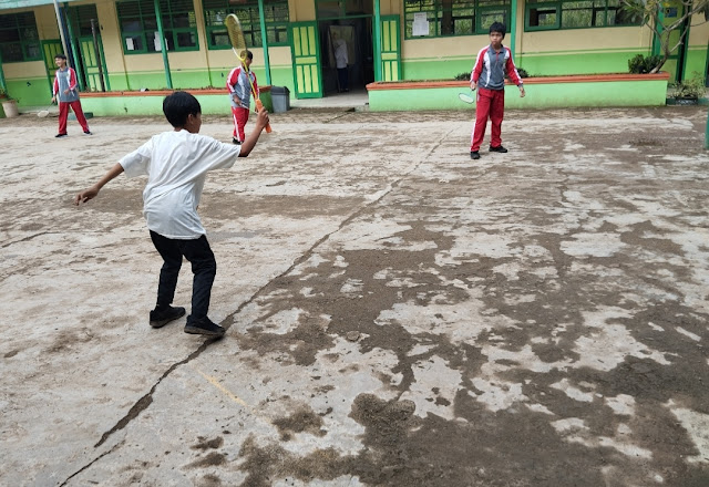 Siswa Kelas VII Madrasah Tsanawiyah Negeri (MTsN) 3 Hulu Sungai Selatan (HSS) bermain bulutangkis, di halaman depan madrasah, yang ada di sekitaran RT 3 Desa Angkinang Selatan, Kecamatan Angkinang, Kabupaten HSS, pada hari Rabu (22/01/2025) pagi. (ahu)
