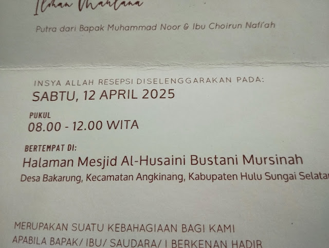 Acara walimah sendiri akan dilaksanakan di halaman Masjid Al Husaini Bustani Mursinah, Desa Bakarung, Kecamatan Angkinang, Kabupaten HSS, pada hari Sabtu, 12 April 2025. (ahu)
